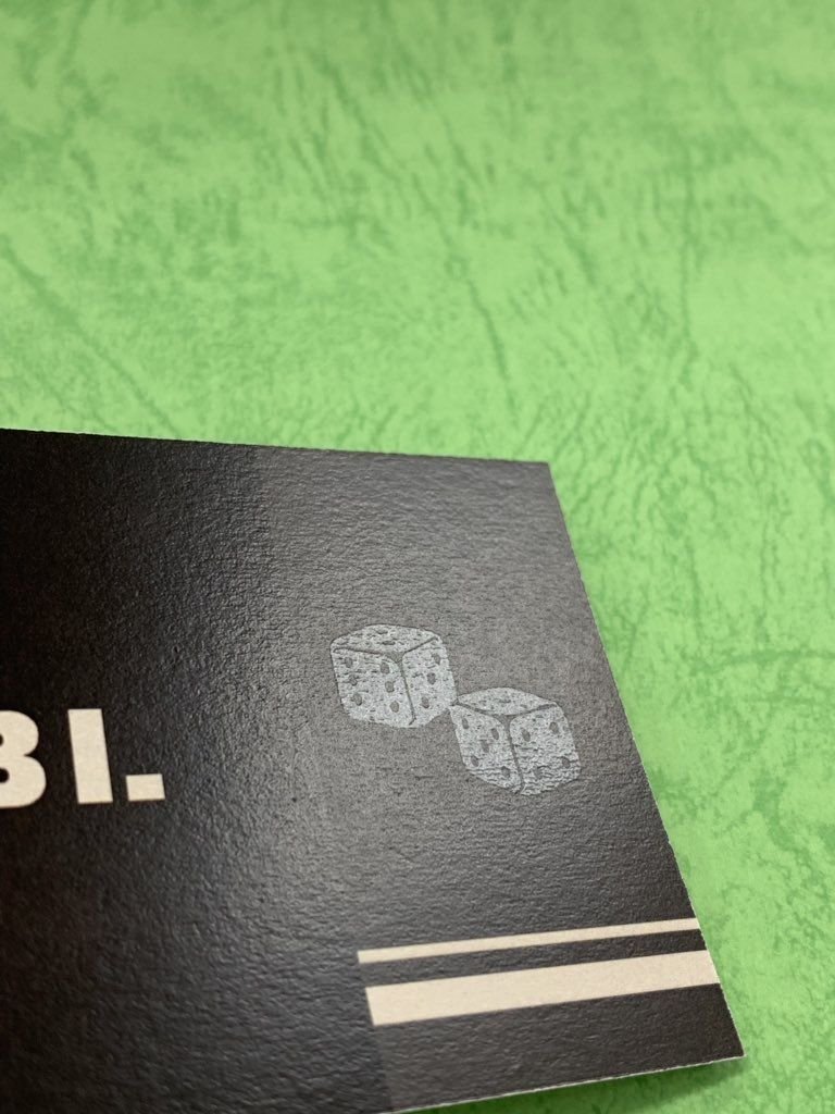 両面に輝くダイスマークにはクリアトナーという光沢の印刷をさせていただきました。シンプルにかっこいいです!